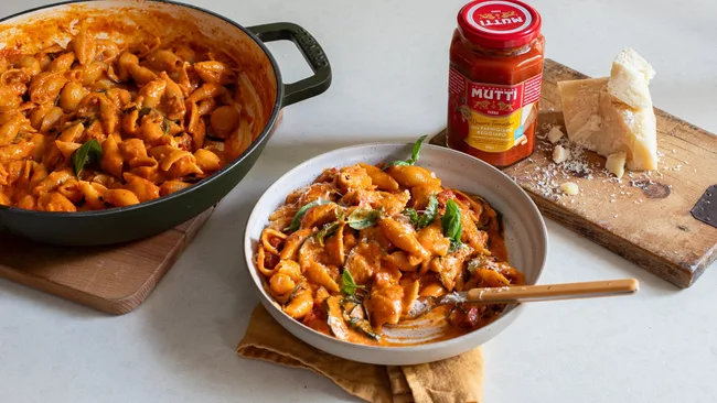 The secret ingredient to this one-pan creamy pasta? A jar of gourmet pasta sauce combining flavoured tomatoes and Parmigiano Reggiano for a sharp and complex sauce. Chorizo and zucchini are a welcome addition.