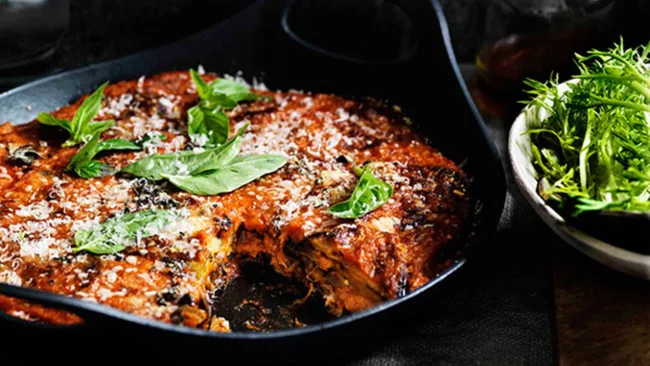 There’s lots to love about eggplant parmigiana, from the layers of soft baked eggplant, sweet-savoury sugo and bubbly parmesan on top. There’s a little labour involved in frying the eggplant slices before layering them, but the impressive result is well worth the effort.