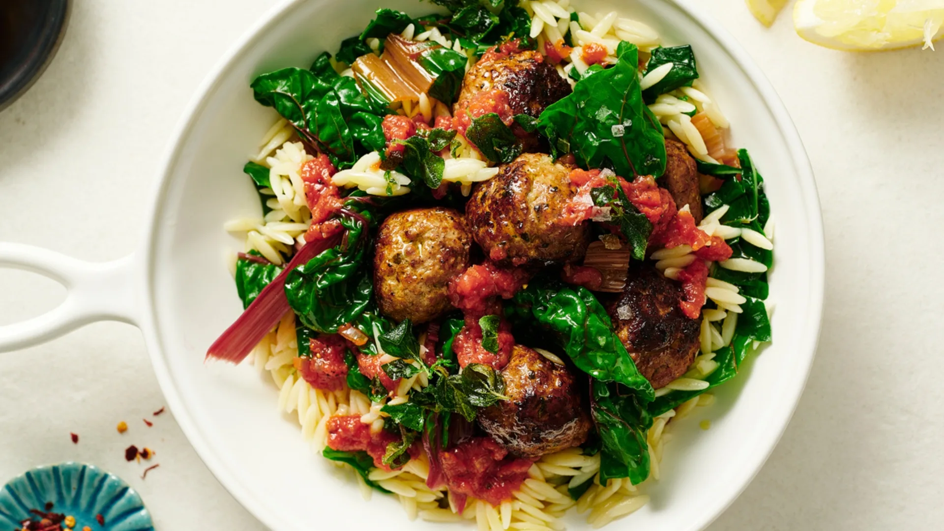 From the juicy lamb meatballs to lemon-infused orzo and fried oregano, this Greek-style dish is an elevated Mediterranean delight.