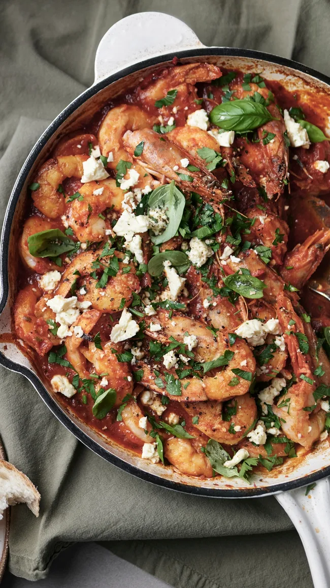 Fresh seafood and tomato collide in this easy Italian classic. Cook large green prawns in a sugo basil sauce peppered with sliced chilli, basil leaves and a sprinkling of crumbled feta. You’ll want to have this recipe on repeat.