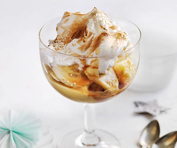 Corn cake trifle with butterscotch, bananas and toasted meringue