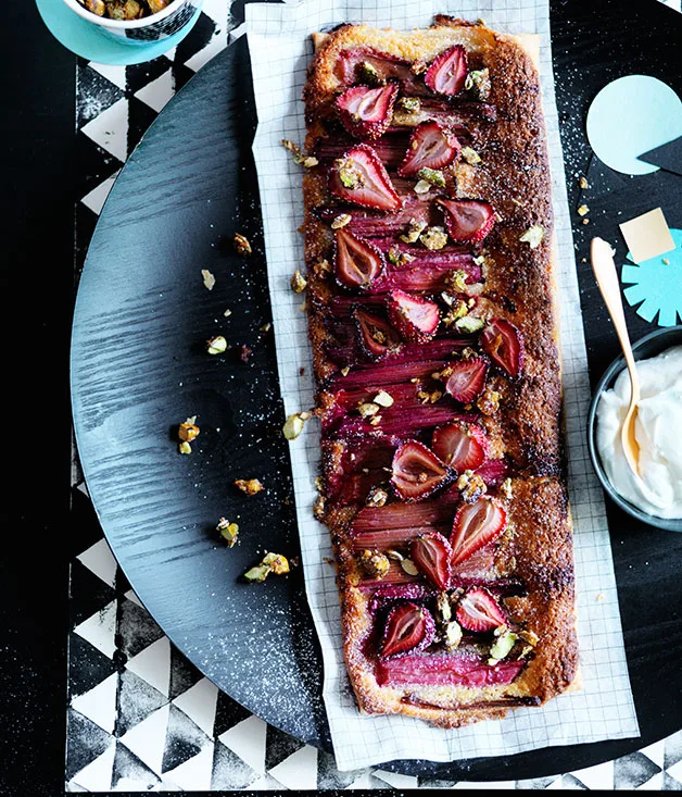 Rhubarb and strawberry tart with candied pistachio and fennel seeds