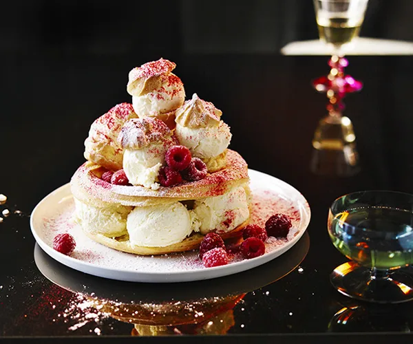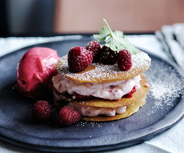Stephanie Alexander’s raspberry and rose-geranium sorbet with honey wafers, raspberries and cream