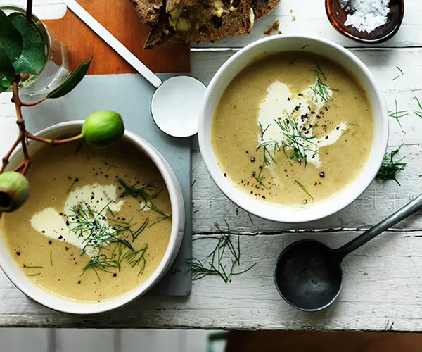 Buttery potato and leek soup with croûtons