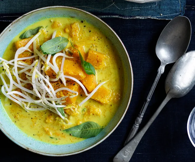 Spiced pumpkin soup with onion bhajis and curry leaves