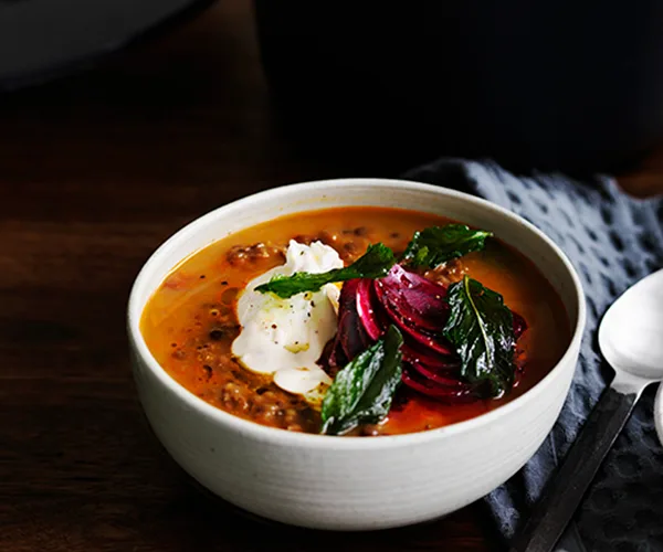 Persian red lentil soup with tahini, beetroot and fried mint