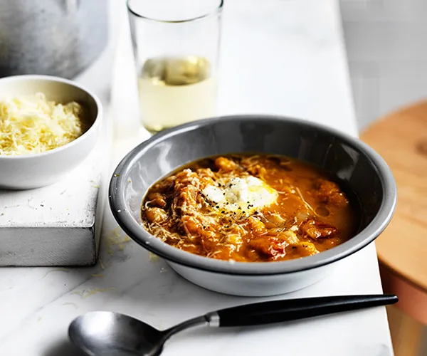 Torn pasta soup with fennel and parmesan croutons