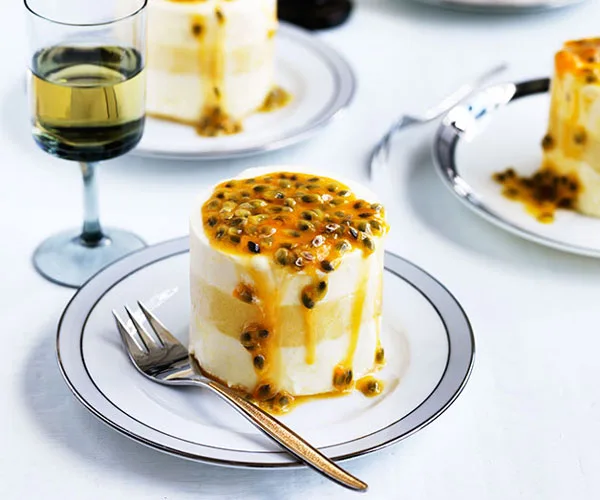 5.To serve, run sides of moulds quickly under hot water and unmould onto a chilled tray, ice-creamside down, or dip sides of terrine mould into hot water and unmould onto a chilled board ice-creamside down and slice into 2cm-thick slices with a hot, wet sharp knife. Place on chilled plates and serve with passionfruit pulp spooned on top.