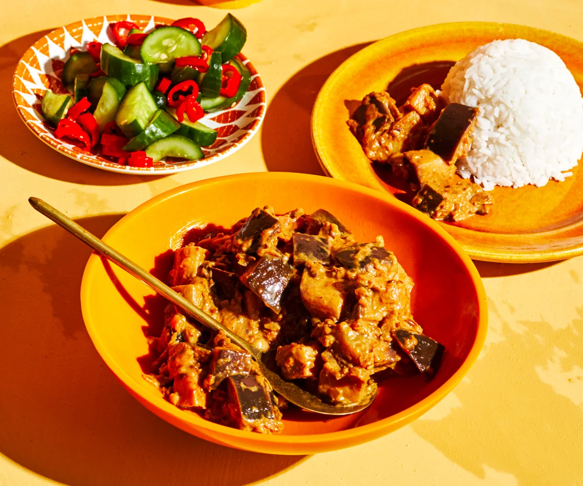 4.Add coconut cream to the pan and cook for another minute. Increase the heat to medium and add another ½ cup water. Add salt to taste and simmer, covered, until the eggplant is soft and sauce has thickened (10-15 minutes). Serve eggplant with rice on the side.