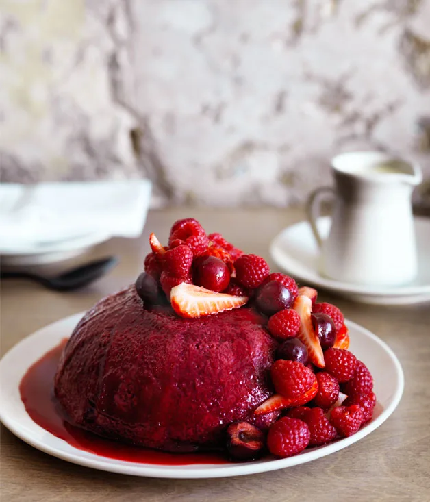 “If you don’t have surplus fresh berries, frozen are a perfect substitute; just give them a little more time in the sauce to warm through and soften,” says Julie Niland. Start this recipe a day ahead to chill and set the pudding.