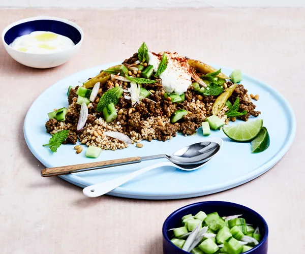 2.To serve, spoon burghul onto plates and make a well in the centre. Top with spiced lamb, pine nuts, pickled chillies, yoghurt, mint, lime wedges and cucumber salad, and sprinkle over paprika.